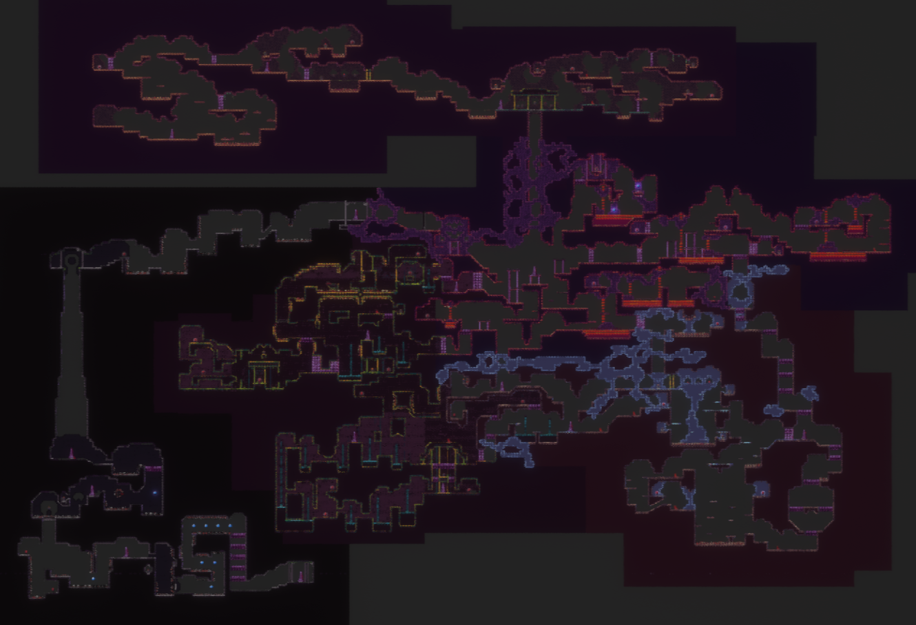 This project began with a design-first, ask-questions-later mindset. Before touching mechanics, I wanted to design the map as a way to discover what abilities and systems the game should be built around. For me, a good Metroidvania isn’t just about the movement, it’s about giving players a good reason to explore, to return to familiar places with new tools, and to understand the world as a series of distinct regions with their own identities and challenges.